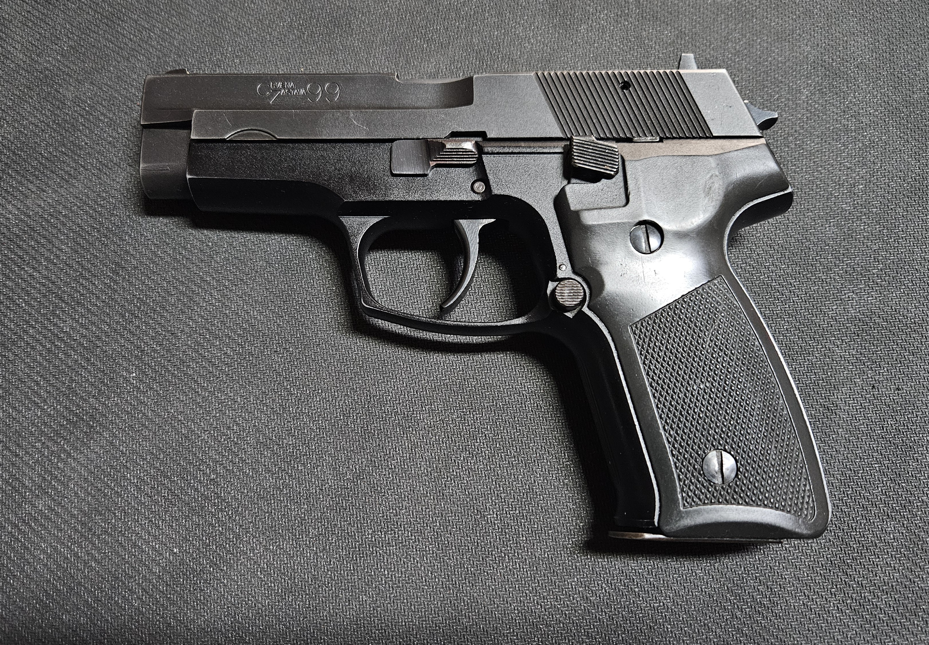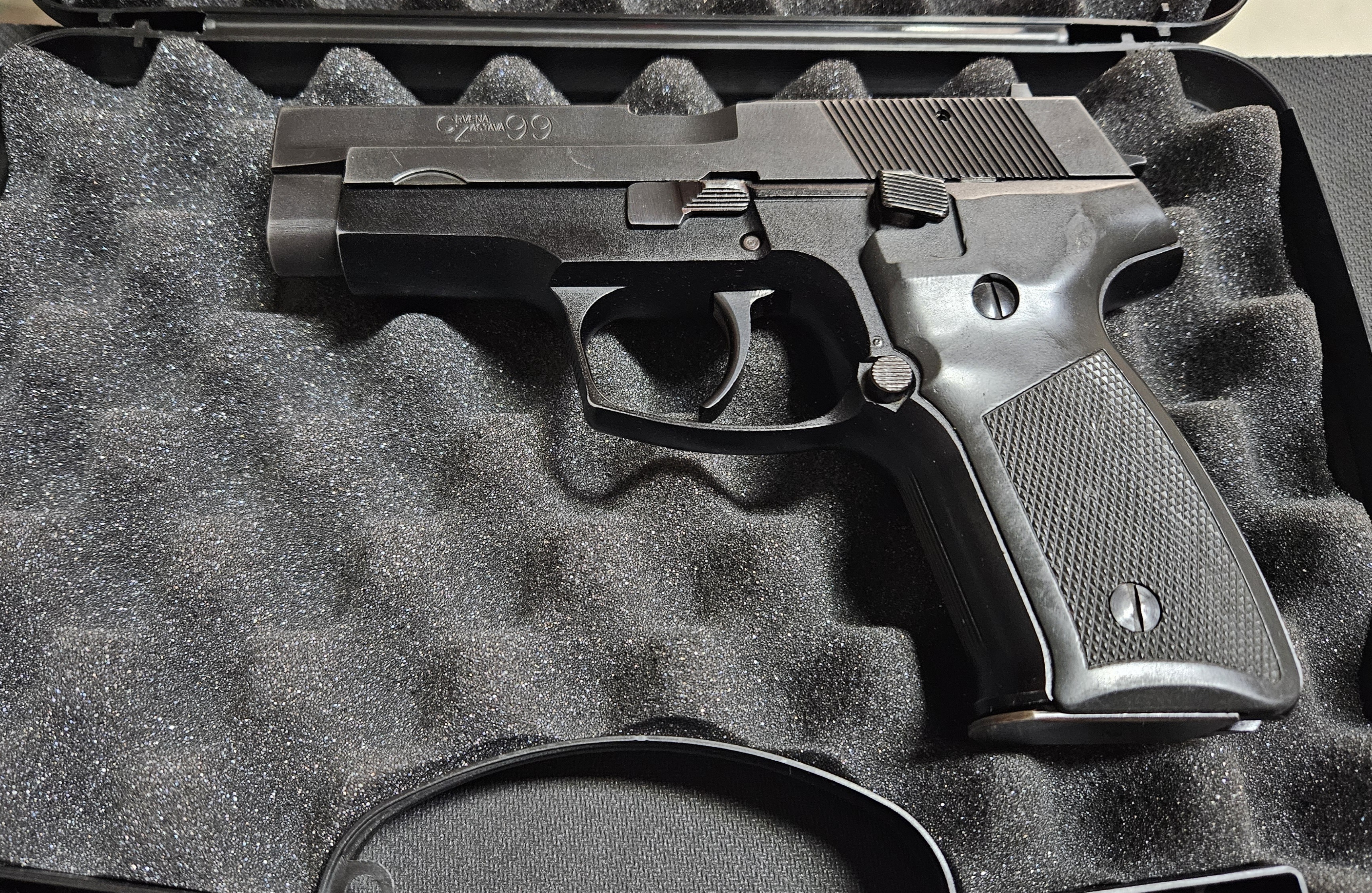 Pištolj Crvena Zastava M-99 u kalibru 9x19 mm , kapacitet spremnika 15 metaka u kompletu sa transportnom kutijom.