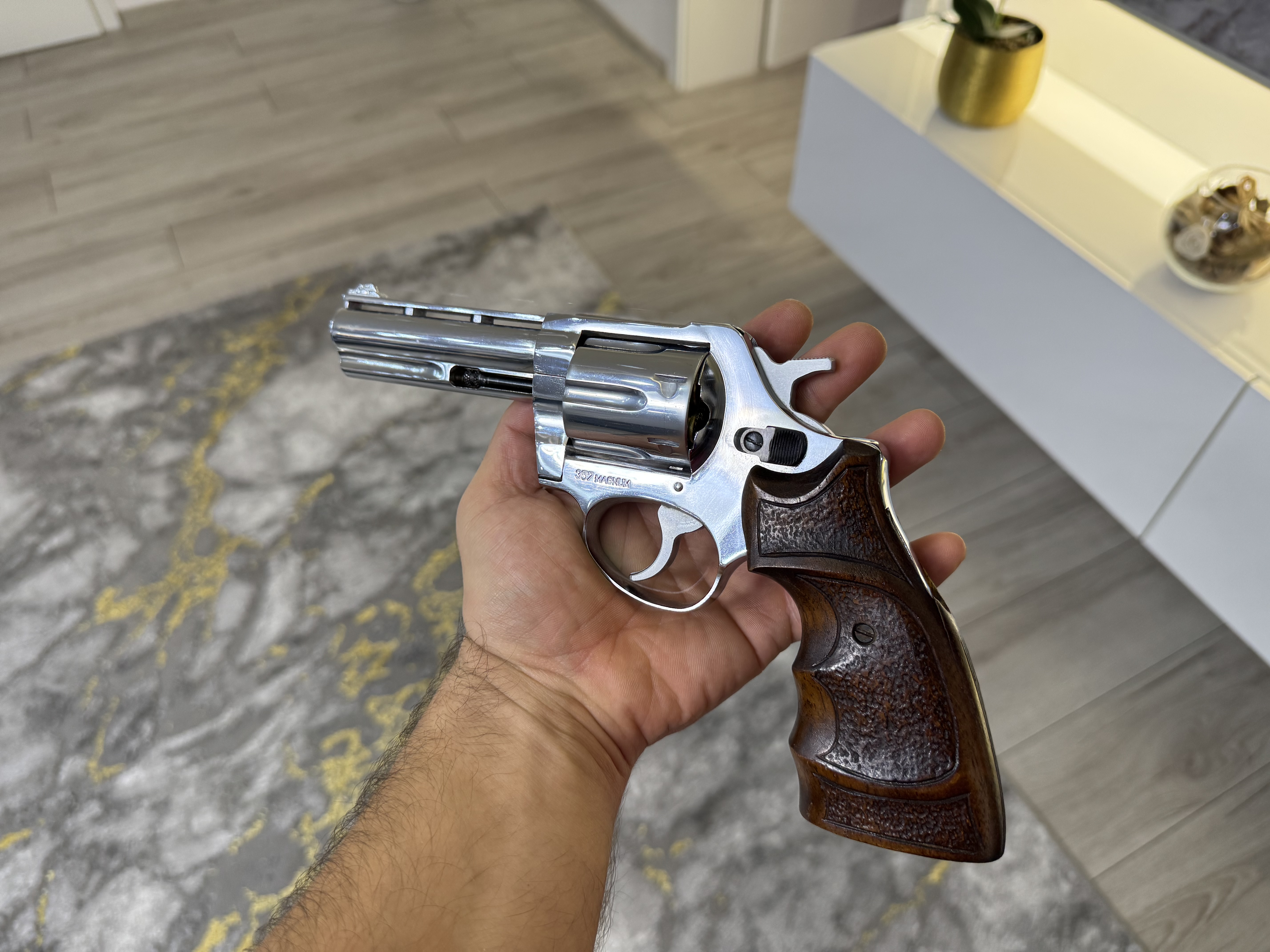 Unikatni Revolver Zastava M83/94 zadnja i najkvalitetnija verzija. Drška rađena od orahovog drveta po narudžbi također urađen tvrdi krom polirani (ogledalo ili Mirror Chrome).